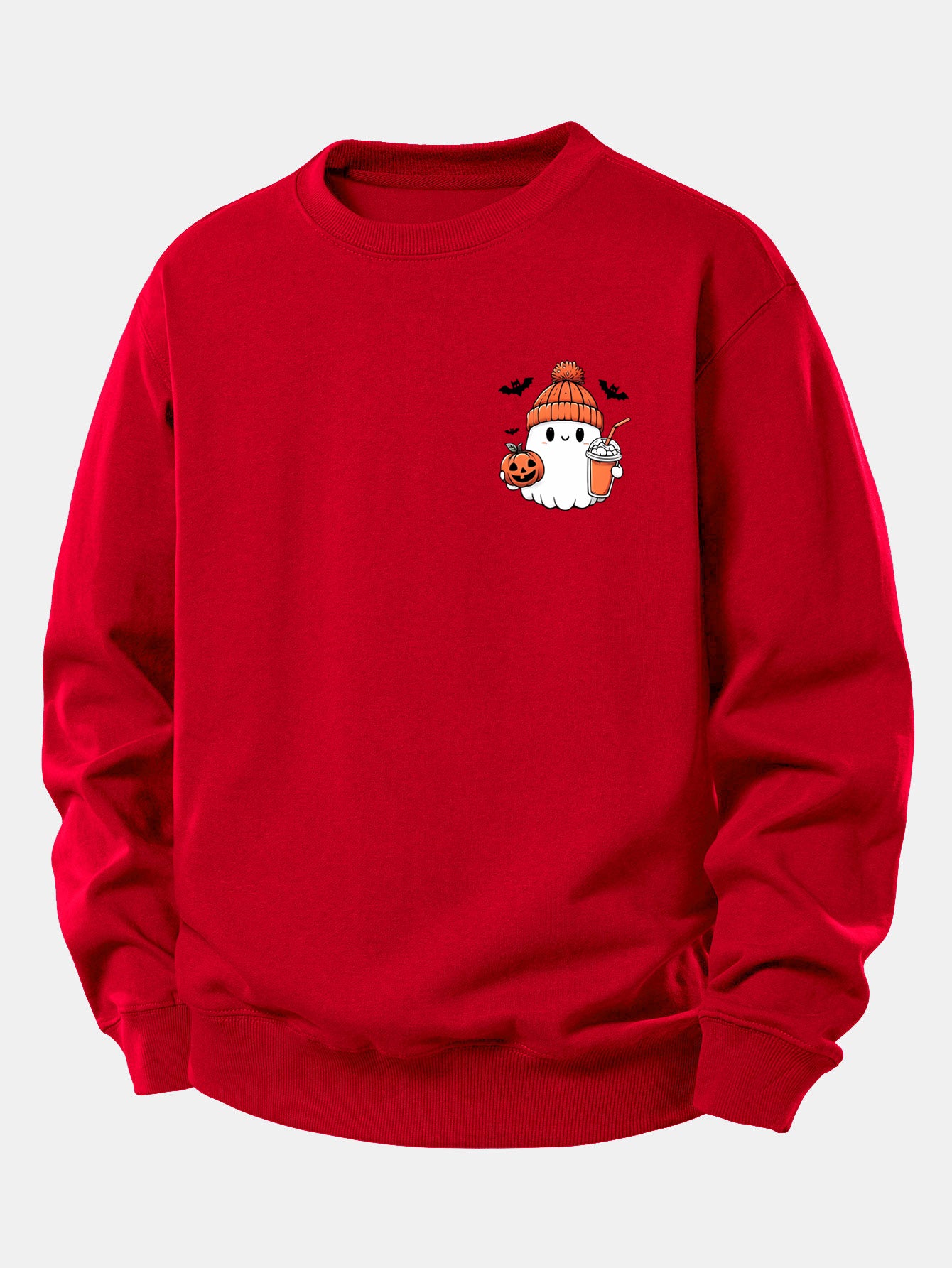 Get cozy and festive with our cute halloween ghost pumpkin print relax fit sweatshirt. Featuring an adorable ghost in a beanie holding a pumpkin spice latte alongside a smiling jack-o'-lantern, this sweatshirt is the perfect mix of spooky and sweet.